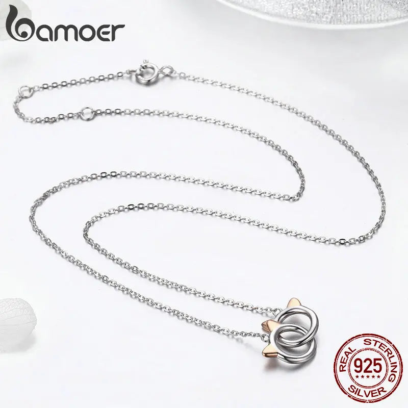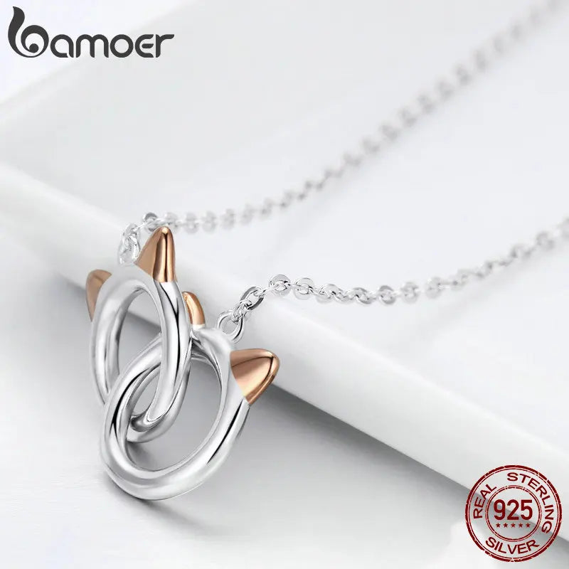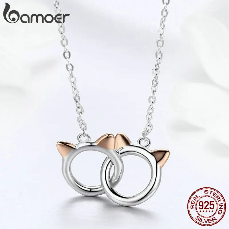 Meet "Bamoer Cats," the purr-fect blend of elegance and feline charm for cat enthusiasts! Crafted with love and precision from genuine 925 Sterling Silver, this metal pendant showcases two interlinked rings, each boasting a pair of adorable cat ears. It's not just jewelry; it's a whimsical celebration of the bond between you and your feline friend.