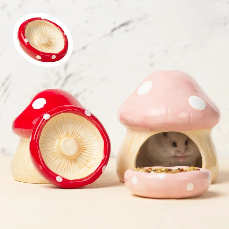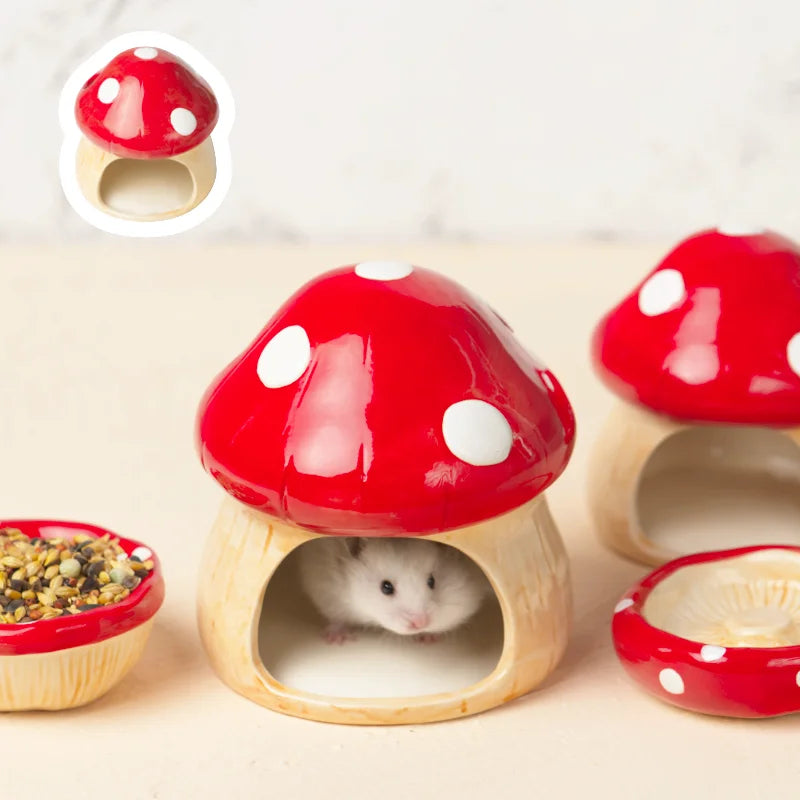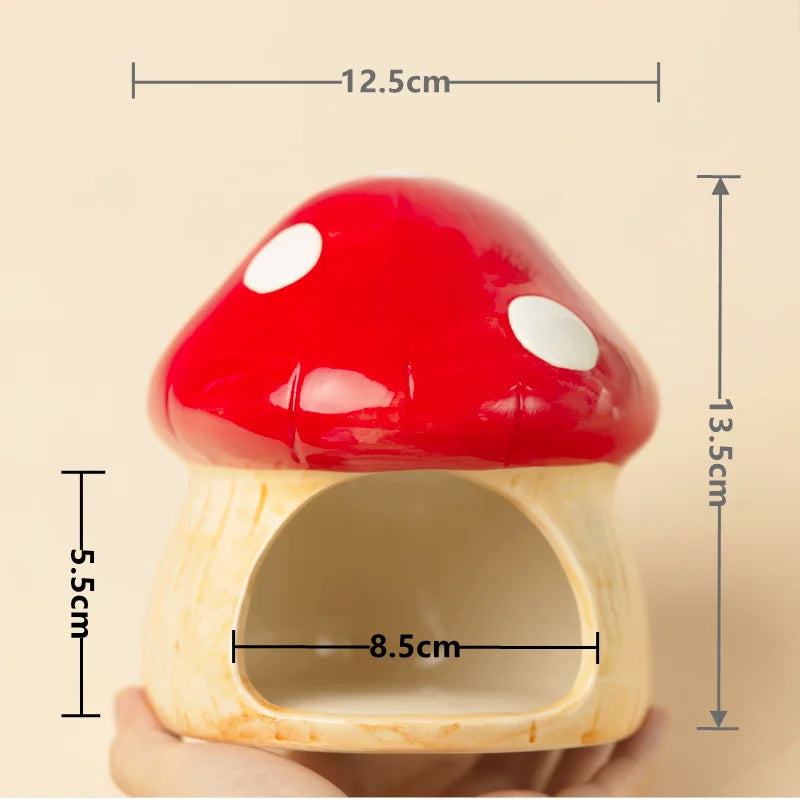 Step into the whimsical world of small pets with "The Mush-room" ceramic hamster house! Shaped like an adorable mushroom, this cozy abode offers your furry friend a snug retreat to snooze, play, or nibble away. With its classic red cap adorned with white dots, it's not just a hideout; it's a charming addition to your pet's habitat.
