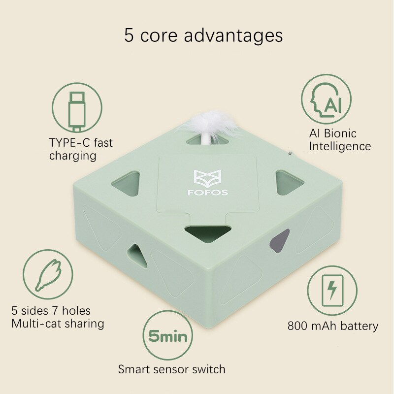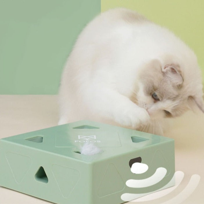 Watch as your feline friend becomes the star of their own show – as they approach, the box unveils a fluffy wonder from one of its many holes. It's a game of "catch me if you can" that'll keep your kitty on their toes, or should we say, paws! And just when they think they've got it all figured out, the little fluff disappears and reappears from another hole, like a feline-friendly whack-a-mole game.